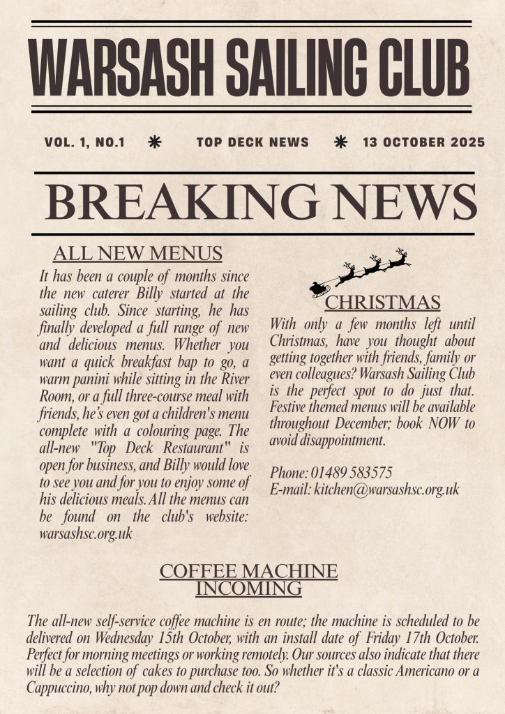 It has been a couple of months since the new caterer Billy started at the sailing club. Since starting, he has finally developed a full range of new and delicious menus. Whether you want a quick breakfast bap to go, a warm panini while sitting in the River Room, or a full three-course meal with friends, he’s even got a children’s menu complete with a colouring page. The all-new “Top Deck Restaurant” is open for business, and Billy would love to see you and for you to enjoy some of his delicious meals. All the menus can be found on the club’s website: warsashsc.org.uk/catering