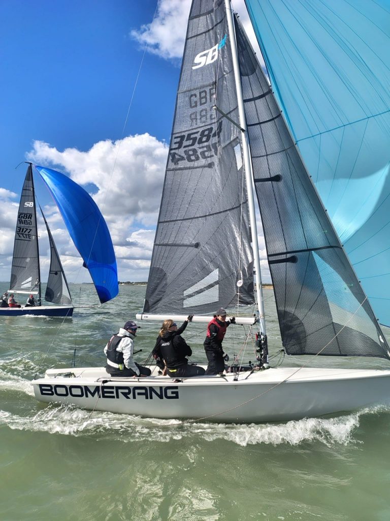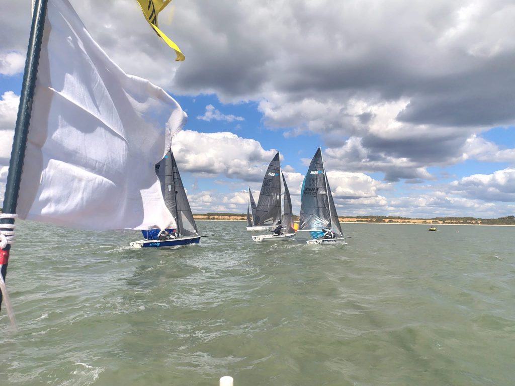 The White Group this year consisted of a modest but very competitive group of SB20s. This group contended very well with the breeze blowing from Southampton Water at the top of the course and from the West closer to the leeward mark. After the first weekend just one point separates Mark Gillett’s PB11 Twenty and Charles Whelan’s Reservoir Bod.
